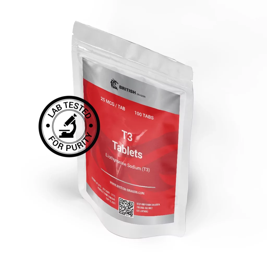 British Dragon T3 contains Liothyronine Sodium in oral tablet form, labeled at 25 mcg per tablet. For low-dose thyroid hormone products, independent lab testing is especially important because even modest deviations can have a significant impact on real-world dosing accuracy.
