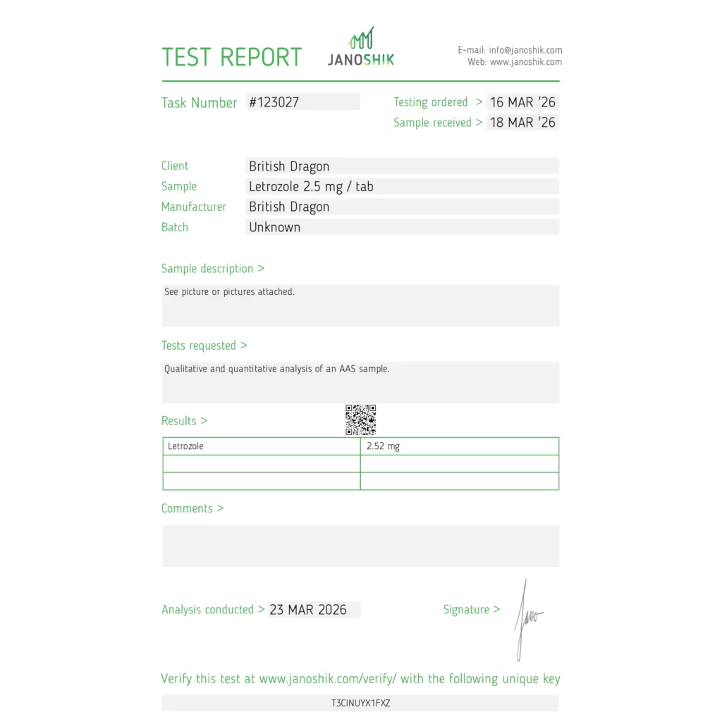 British Dragon Letrobol contains Letrozole in oral tablet form, formulated at 2.5 mg per tablet. As a low-dose compound, Letrozole requires precise dosing to ensure consistent performance, making independent lab testing especially important.